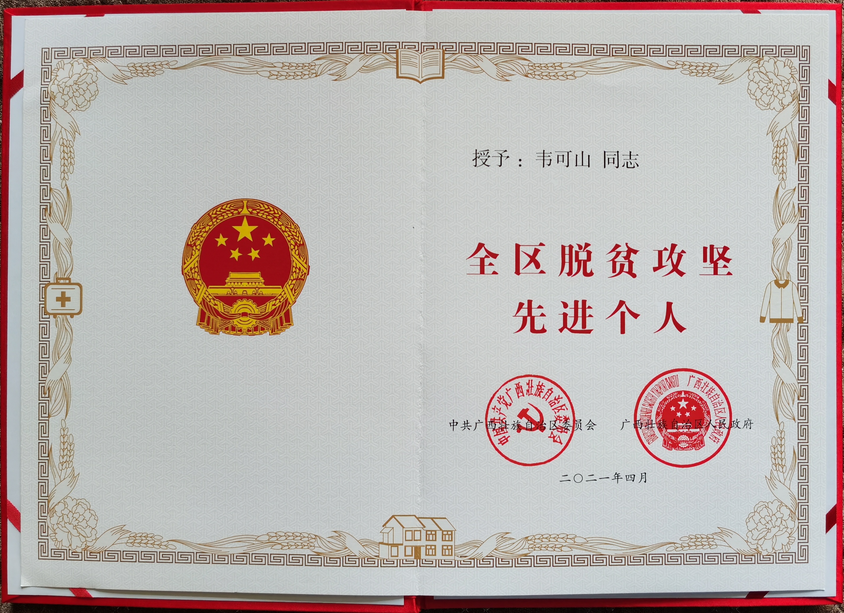 广西建院5月8日讯(党委组织部 潘金德)近日,乐鱼全球最大体育平台_乐鱼(中国)韦可山同志被自治区党委、政府授予“全区脱贫攻坚先进个人”荣誉称号。 自2015年8月以来,包括韦可山同志在内的乐鱼全球最大体育平台_乐鱼(中国)挂任都安县6个贫困村的第一书记和工作队员认真落...