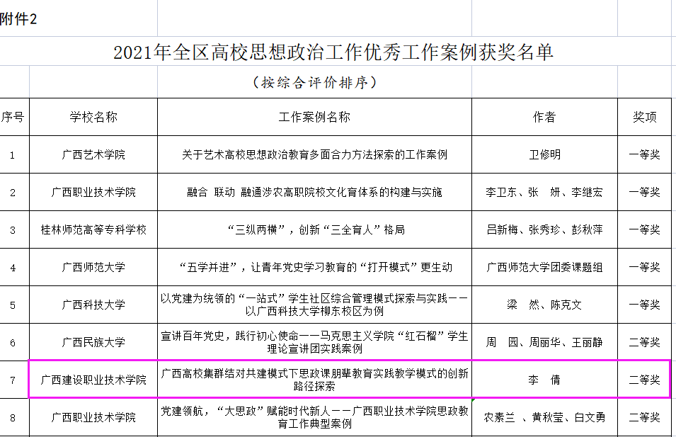 广西建职院12月2日讯(马克思主义学院 甘麒燕)近日,自治区教育厅公布了2021年全区高校思想政治工作优秀调研报告和工作案例获奖名单,乐鱼全球最大体育平台_乐鱼(中国)教师李生、曾菁、毕莉的《广西公办高职院校思政课教师队伍建设面临的困境与...