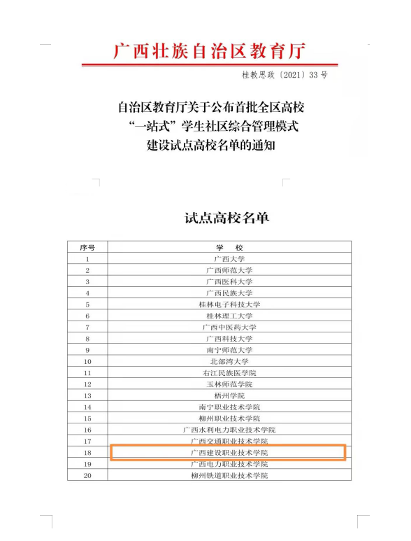 广西建院12月8日讯(党委学生工作部 杨海基)近日,自治区教育厅发布了《自治区教育厅关于公布首批全区高校“一站式”学生社区综合管理模式建设试点高校名单的通知》(桂教思政〔2021〕33号),乐鱼全球最大体育平台_乐鱼(中国)与广西大学等20所...
