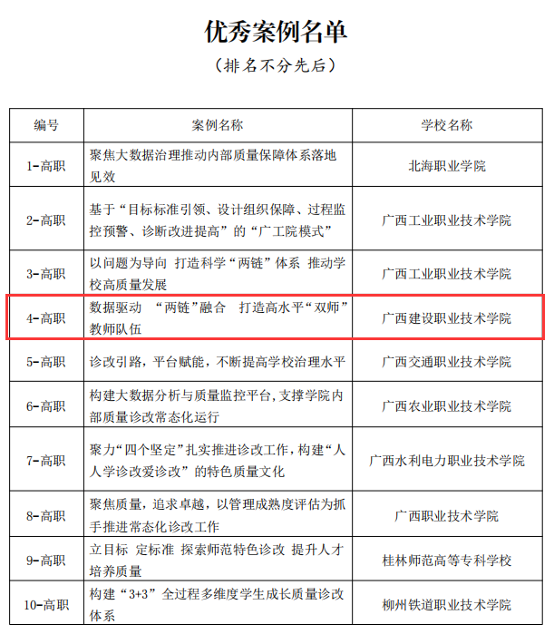 广西建院12月28日讯(质量管理办公室 覃珊珊)近日,自治区教育厅下发《关于公布职业院校内部质量保证体系诊断与改进制度建设优秀案例的通知》,乐鱼全球最大体育平台_乐鱼(中国)案例《“数据驱动‘两链’融合 打造高水平‘双师’教师队伍”...