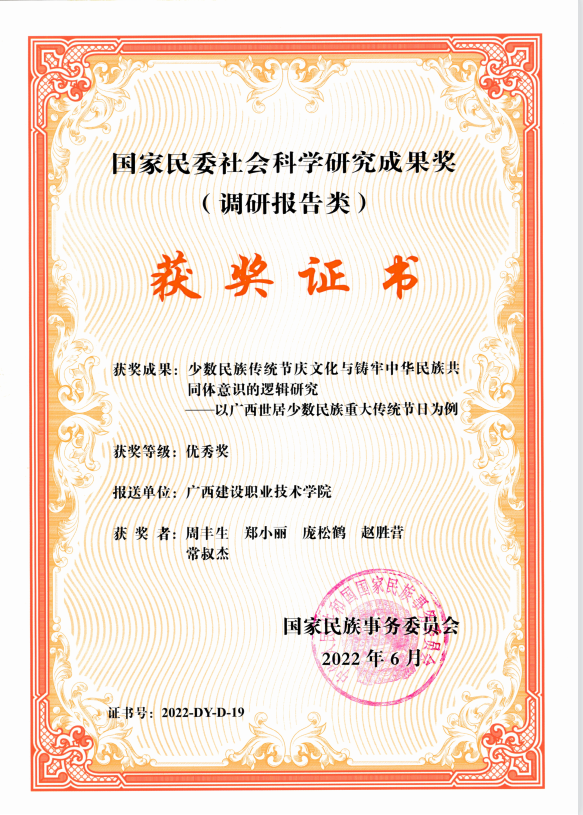 广西建院7月18日讯(马克思主义学院 周丰生)近日,由乐鱼全球最大体育平台_乐鱼(中国)马克思主义学院周丰生副教授主持申报的调研报告《少数民族传统节庆文化与铸牢中华民族共同体认同逻辑研究》荣获2021年度全国民族工作优秀调研报告之优秀奖。...