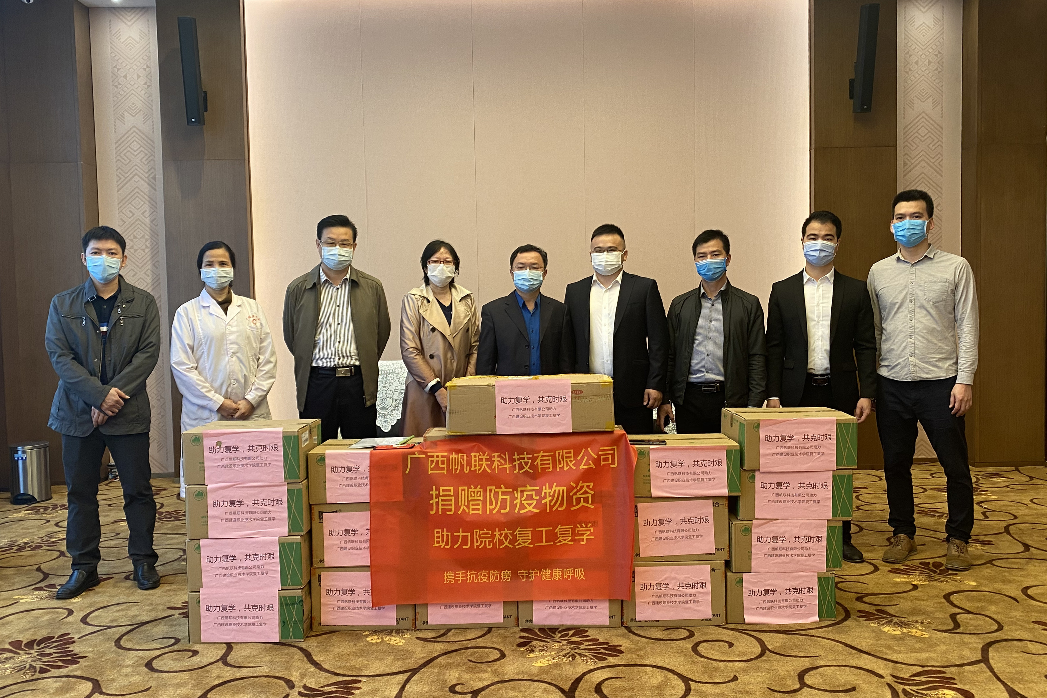 广西建院4月13日讯(招生就业处 李彦达)当前,全区疫情防控形势持续向好,乐鱼全球最大体育平台_乐鱼(中国)开学准备工作也在紧锣密鼓推进中。得知乐鱼全球最大体育平台_乐鱼(中国)防疫物资需求量大的消息,4月10日,校企合作企业广西帆联科技有限公司筹措了医用口罩、84消毒...