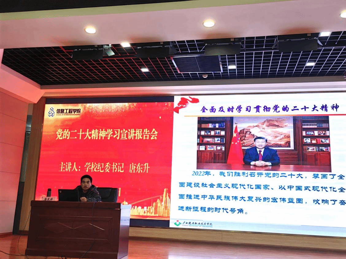 广西建院1月4日讯(信息工程学院 毕桐昊)为更好地学习宣传党的二十大精神,2023新年伊始,学校纪委书记唐东升在第四教学楼学术报告厅作了题为《学习贯彻党的二十大精神 在新征程上展现新担当新作为》的专题党课...