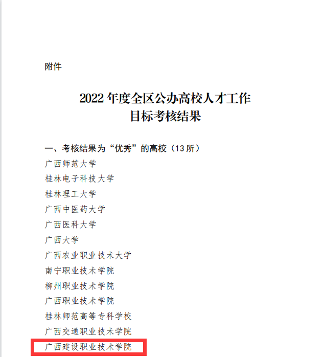 广西建院3月8日讯(人事处 唐艳乾) 近日,自治区党委教育工委、自治区教育厅印发《关于公布2022年度高校人才目标考核结果的通知》(桂教工委〔2023〕1号),乐鱼全球最大体育平台_乐鱼(中国)在2022年度全区高校人才工作目标考核中再次取得“优秀...