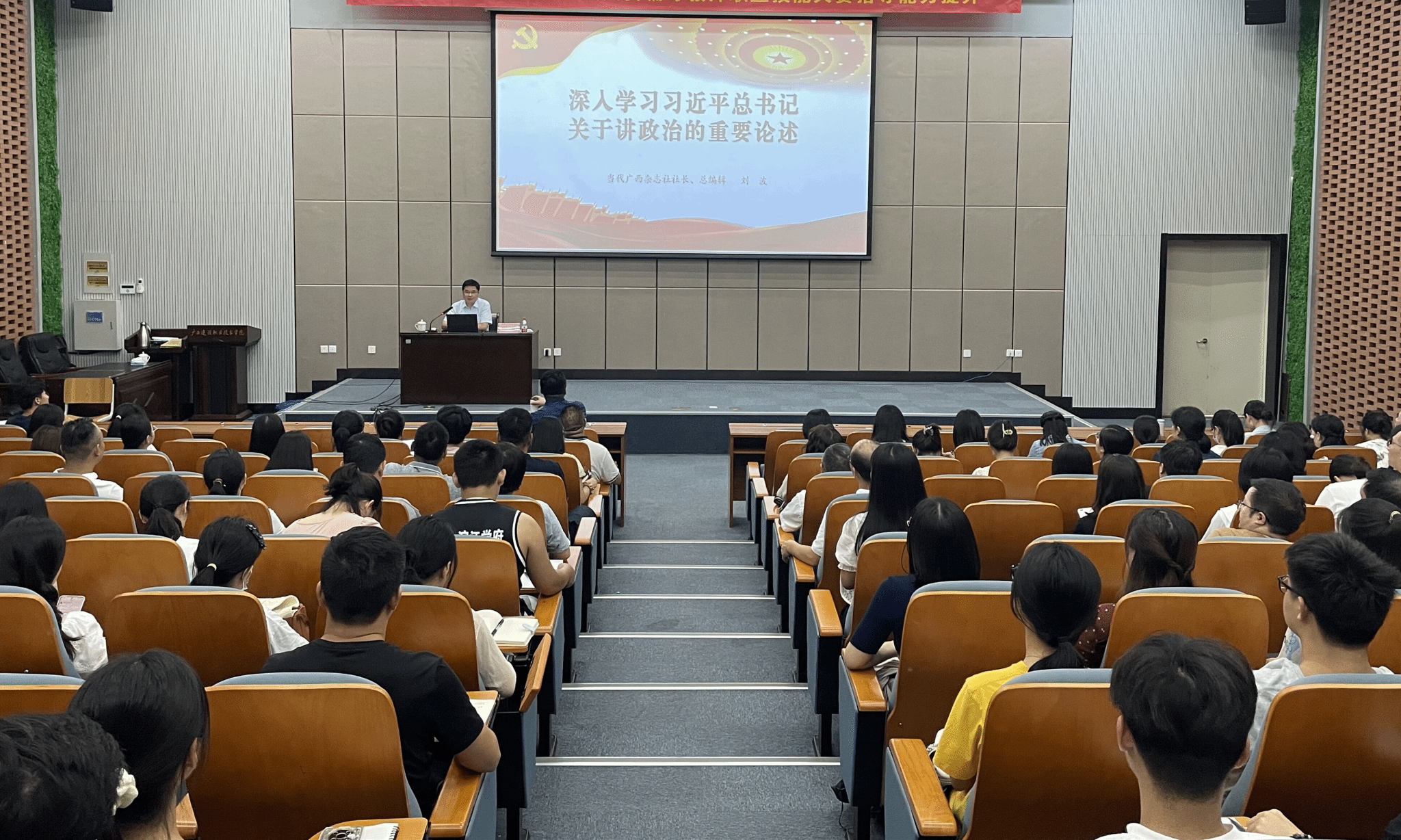 广西建院9月6日讯(马克思主义学院 曹桃)为深入学习习近平总书记关于讲政治的重要论述,9月5日,乐鱼全球最大体育平台_乐鱼(中国)邀请当代广西杂志社社长、总编辑刘波在6教3楼报告厅开展专题讲座,全体思政课教师、辅导员、学生党员代表以及学生入党积极分子代表到会听讲。讲座由马克思主义学院党总支书记、院长邱岚主持。刘波社长紧紧围绕习近平总书记关于讲政治的重要论述,从旗帜鲜明讲政治是马克思主义政党的根本要求、党的政治建设是党的根本性建设、把新时代讲政治的要求内化于心外化于行三个方面进行阐述,...