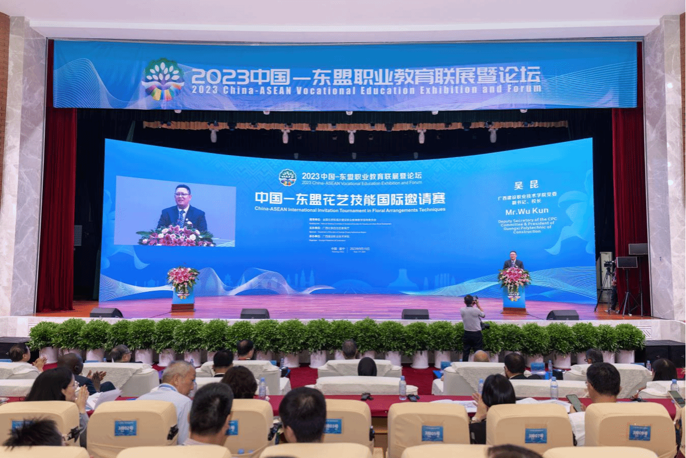 广西建院9月16日讯(文/党委宣传部 韦植巍 图/党委宣传部)9月15日,由全国住房和城乡建设职业教育教学指导委员会指导,广西壮族自治区教育厅主办,乐鱼全球最大体育平台_乐鱼(中国)(以下简称“广西建院”)承办2023中国—东盟花艺技能国际邀请赛圆满落下帷幕,颁奖仪式在广西建院举行。中国工程院院士、中国乐鱼全球最大体育平台_乐鱼(中国)股份有限公司首席专家肖绪文,住房和城乡建设部人事司一级巡视员何志方,住房和城乡建设部人力资源开发中心副主任、全国住房和城乡建设职业教育教学指导委员会副主任委员兼秘书长程鸿,...
