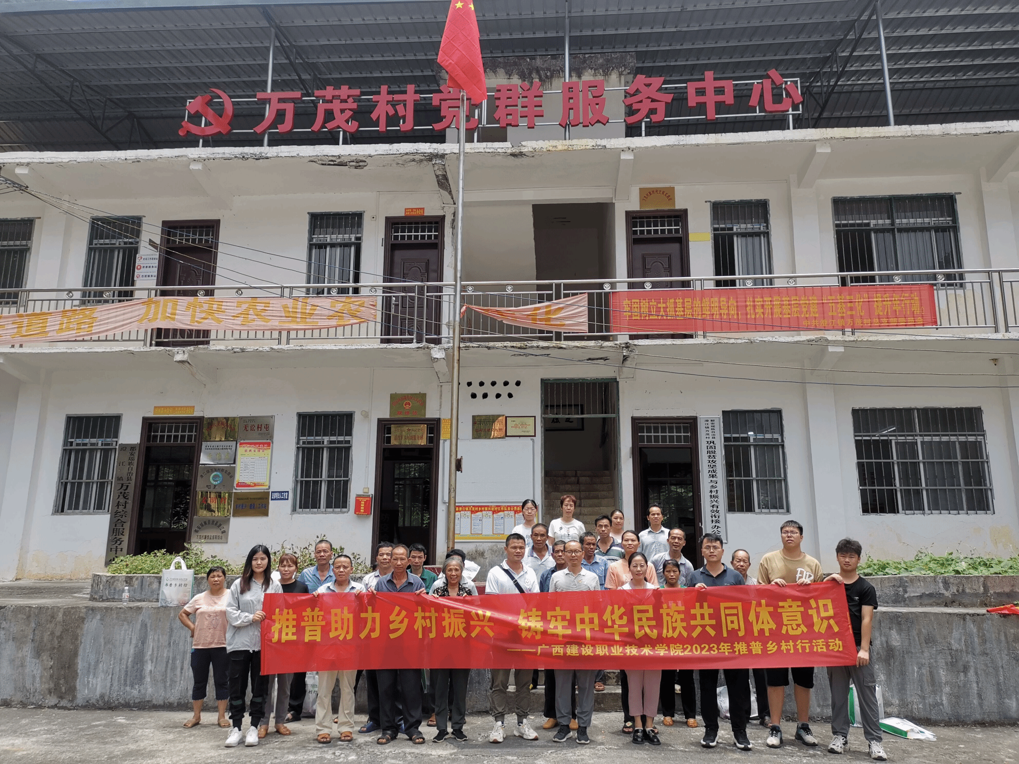 广西建院7月9日讯(人文教育学院 文/盛丽梅 图/贾丽君)7月7日,一支由广西建院语言文字工作委员会、人文教育学院党支部的相关领导和工作人员、在校大学生组成的推普实践团兴致勃勃地赶往河池市都安县万茂村,开展“推普乡村行”活动。活动旨在通过与当地群众的深度融合,帮助村民提高自觉说好普通话的意识,消除语言隔阂,促进社会交往,帮助村民提高生产生活能力,助力乡村文化振兴。“推普乡村行”活动合影活动主要以讲解普通话知识及开展普通话游戏的形式开展。...