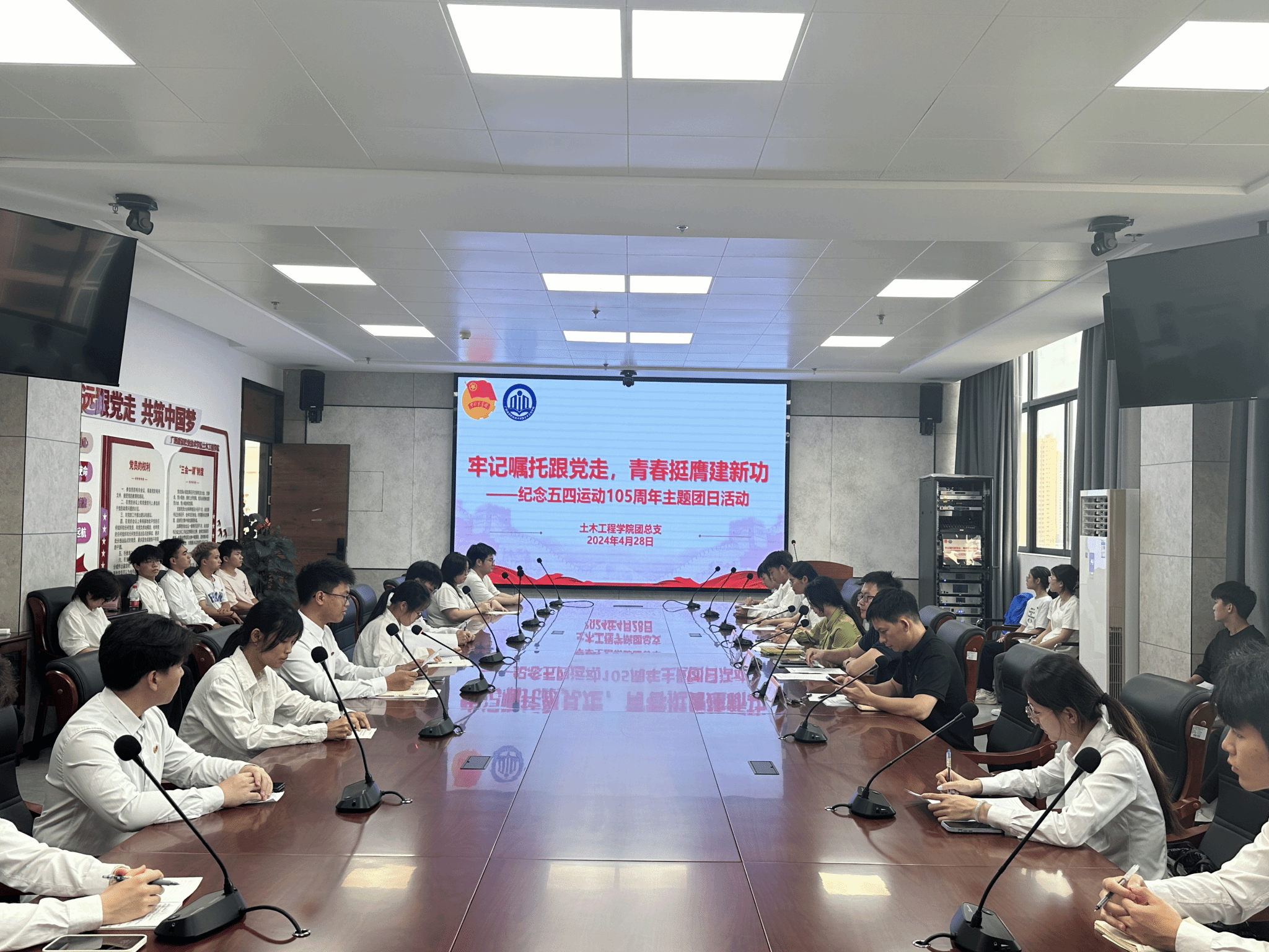 广西建院4月30日讯(文/潘秀镇 石明成 图/孙艺菡)为弘扬五四精神,纪念五四运动105周年,土木工程学院于4月28日下午在5教10楼会议室开展了“牢记嘱托跟党走 青春挺膺建新功”——纪念五四运动105周年主题团日活动。土木工程学院团总支书记冯光帆,团总支副书记潘秀镇、谭妍以及学生骨干代表、各班团员青年代表参加了本次主题团日活动。活动现场活动伊始,全体与会人员高唱《中国共产主义青年团团歌》。团总支副书记潘秀镇带领大家学习习近平总书记在纪念五四运动100周年大会上重要讲话精神,...