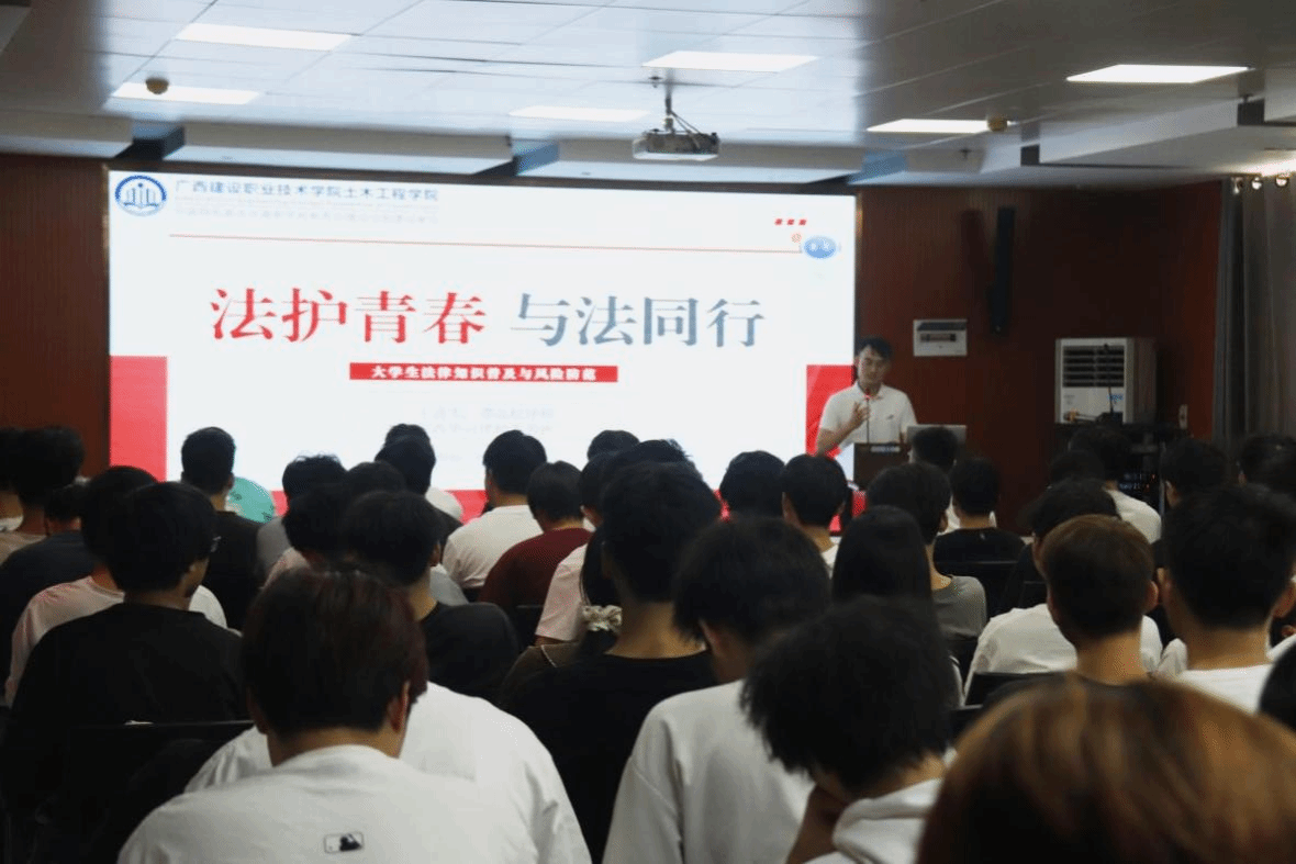 广西建院11月6日讯(土木工程学院 文/石明成 图/张伟 赵子丞)为加强学生法治素养与法治意识,11月1日,土木工程学院在5教906会议室开展了大学生法律知识普及与风险防范主题讲座,特邀广西华司律师事务所谭富松律师为主讲嘉宾,共110名学生参加本次讲座。讲座由郑敏琦老师主持。谭富松律师围绕非法狩猎、赌博、网络诈骗、网络舆论等四个方面,列举生活中的真实案例,结合相关的法律条例,阐述违法违纪行为带来的后果,告诫同学们要增强法律底线意识和犯罪预防意识,...