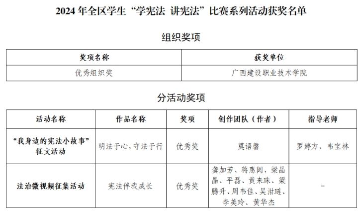广西建院4月21日讯(党委学生工作部 韦宝林)近日,自治区教育厅、自治区司法厅、自治区科协公布2024年全区学生“学宪法 讲宪法”系列活动获奖名单,乐鱼全球最大体育平台_乐鱼(中国)喜获2024年全区学生“学宪法 讲宪法”系列活动“优秀组织奖”,艺术设计学院莫语馨同学创作的征文作品《明法于心,守法于行》获评“我身边的宪法小故事”征文活动优秀奖;信息工程学院师生团队创作的视频作品《宪法盼我成长》荣获法治微视频征集活动优秀奖。 获奖名单一直以来,...