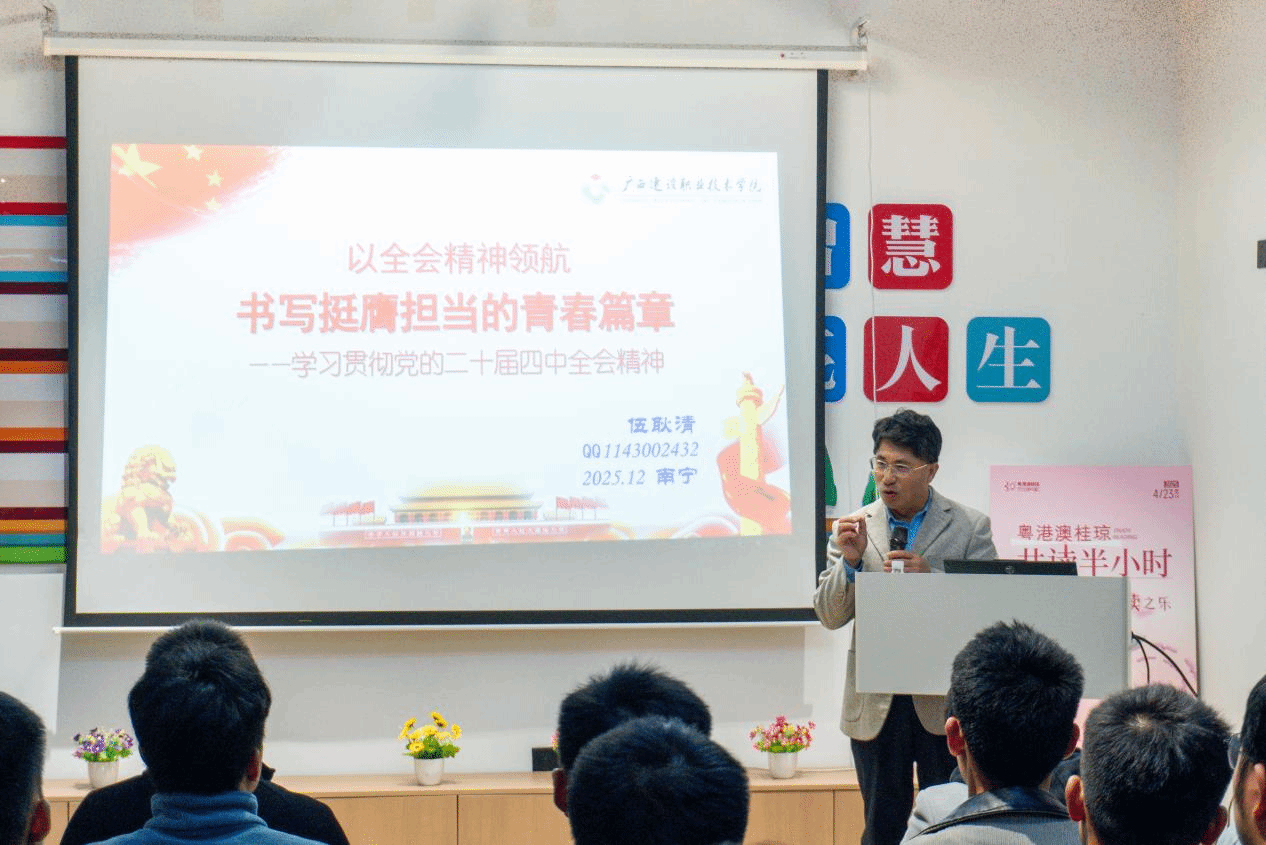 为深入学习贯彻党的二十届四中全会精神,引导广大青年学子筑牢思想根基、勇担时代使命,近日,艺术设计学院特邀广西学校国防教育学会副会长、乐鱼全球最大体育平台_乐鱼(中国)原副校长伍耿清,走进乐鱼全球最大体育平台_乐鱼(中国)“一站式”学生社区书苑,开展专题理论辅导。艺术设计学院师生代表共同参加学习。授课现场师生认真聆听伍耿清教授以“以全会精神领航,书写挺膺担当的青春篇章”为主题,紧扣党的二十届四中全会精神的核心要义,结合新时代青年的历史使命与成长实际,从理论逻辑、...
