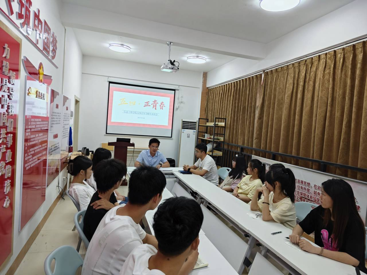 广西建院5月6日讯(信息工程学院 平磊)为深入学习贯彻党的二十大精神,弘扬五四精神,5月4日下午,信息工程学院在学生公寓党建工作室组织召开五四青年节师生座谈会。辅导员平磊老师、郑纬华老师,学生代表20余...