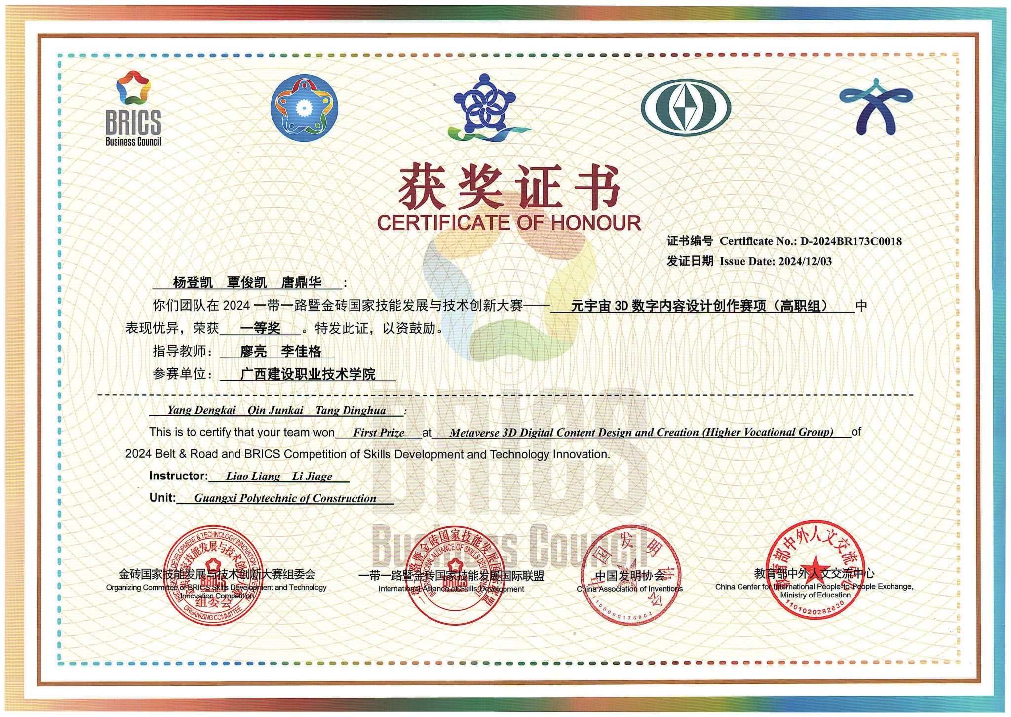 获得广西区赛金奖1项、银奖7项、铜奖12项