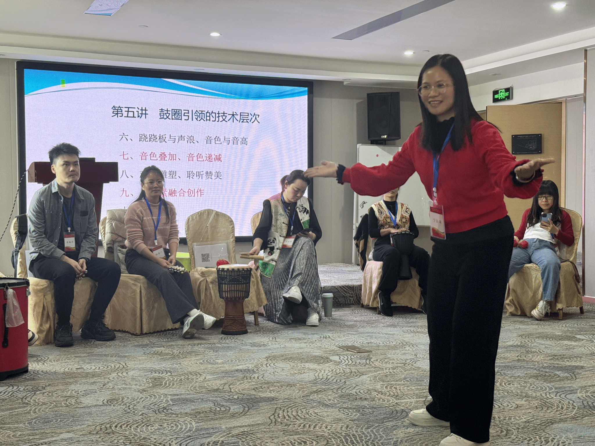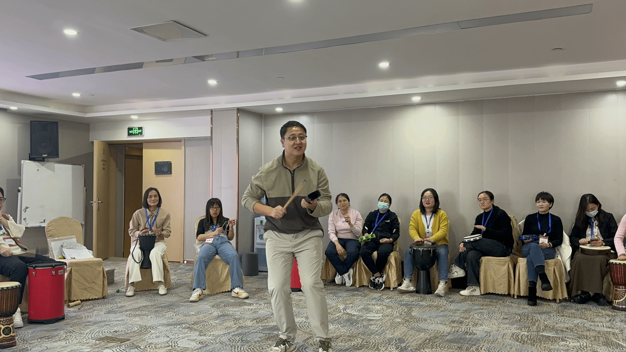 本次培训过程中,国际鼓圈引导师唐灏珂老师用生动丰富的肢体语言引导参与者拿着手中的乐器围圈而坐,在区间内跟随的肢体或声音指令即兴演奏。随着老师的口令和节奏,大家尽情地击打手中的乐器,“和而不同”,缓解压力,体验积极情绪。与以往的心理培训不同,本次培训更注重实操。老师给大家示范了注意、指令、渐强弱等十项引领技术。参与培训的老师轮流上场担当引导师,引导大家一起与音乐同频共振。
